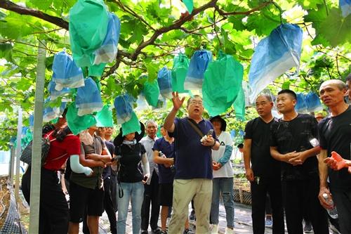 7月9日,参加温岭市葡萄提质增效高素质培训班的学员,在津岭农业科技有限公司葡萄园听中国农科院植保所研究员王忠跃(中)讲解葡萄优质栽培新技术。