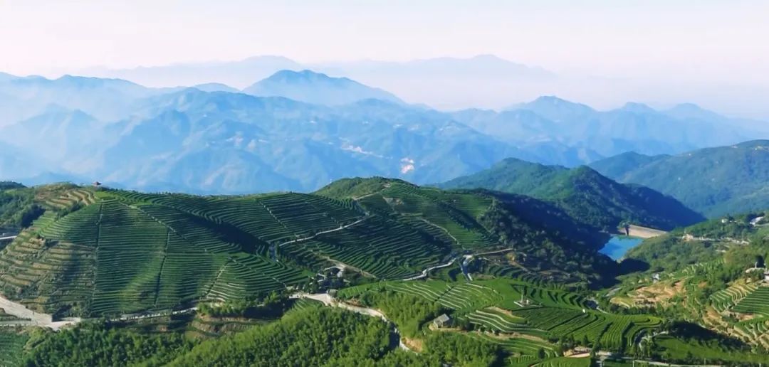 沿着山路盘旋而上,行至山顶,豁然开朗。羊岩茶场藏于山头,碧绿的茶园,一眼望不到边,与蔚蓝的天空融为一体。